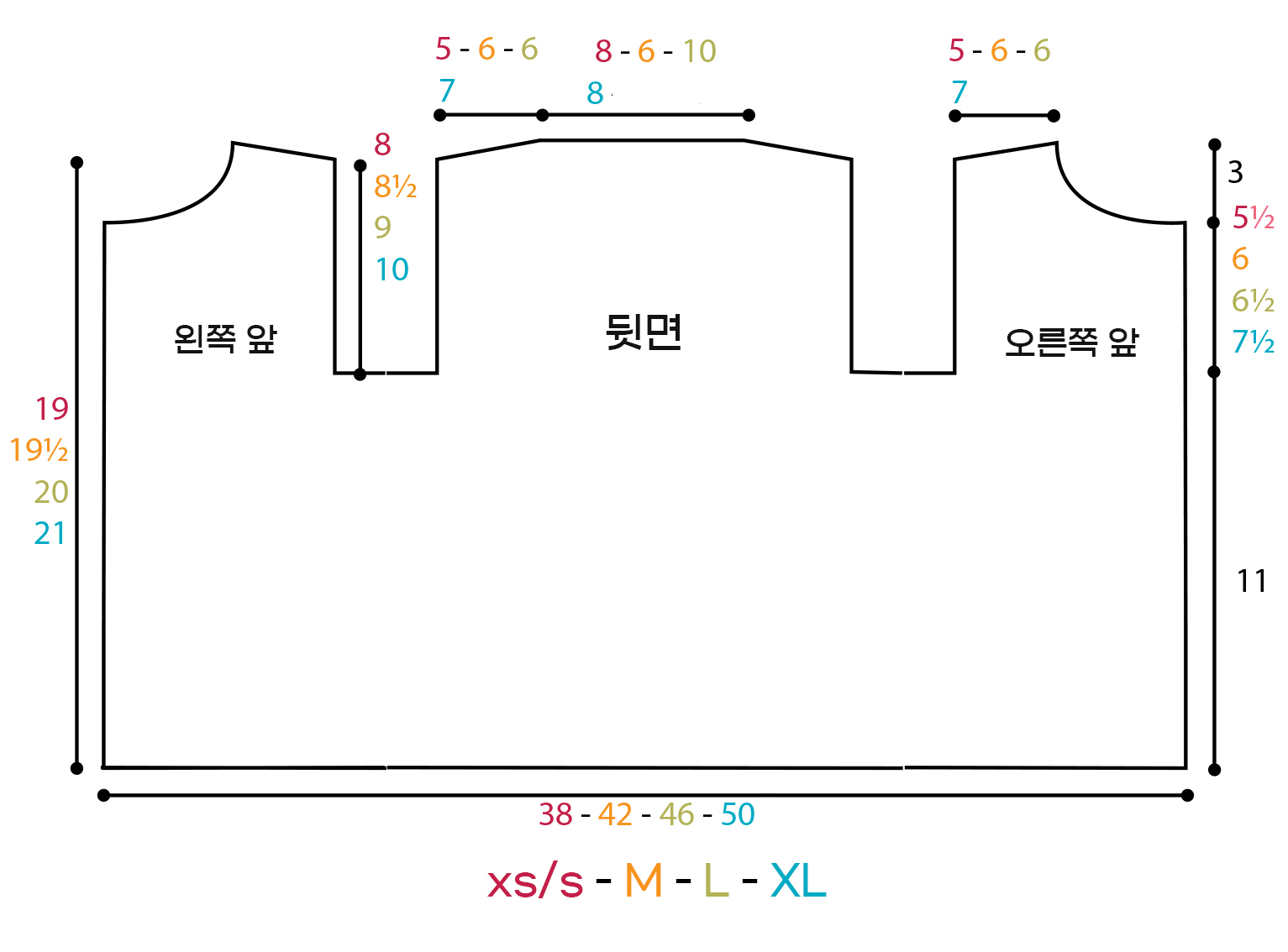 - XS/S: 71~86.5 cm (완성: 99 cm)